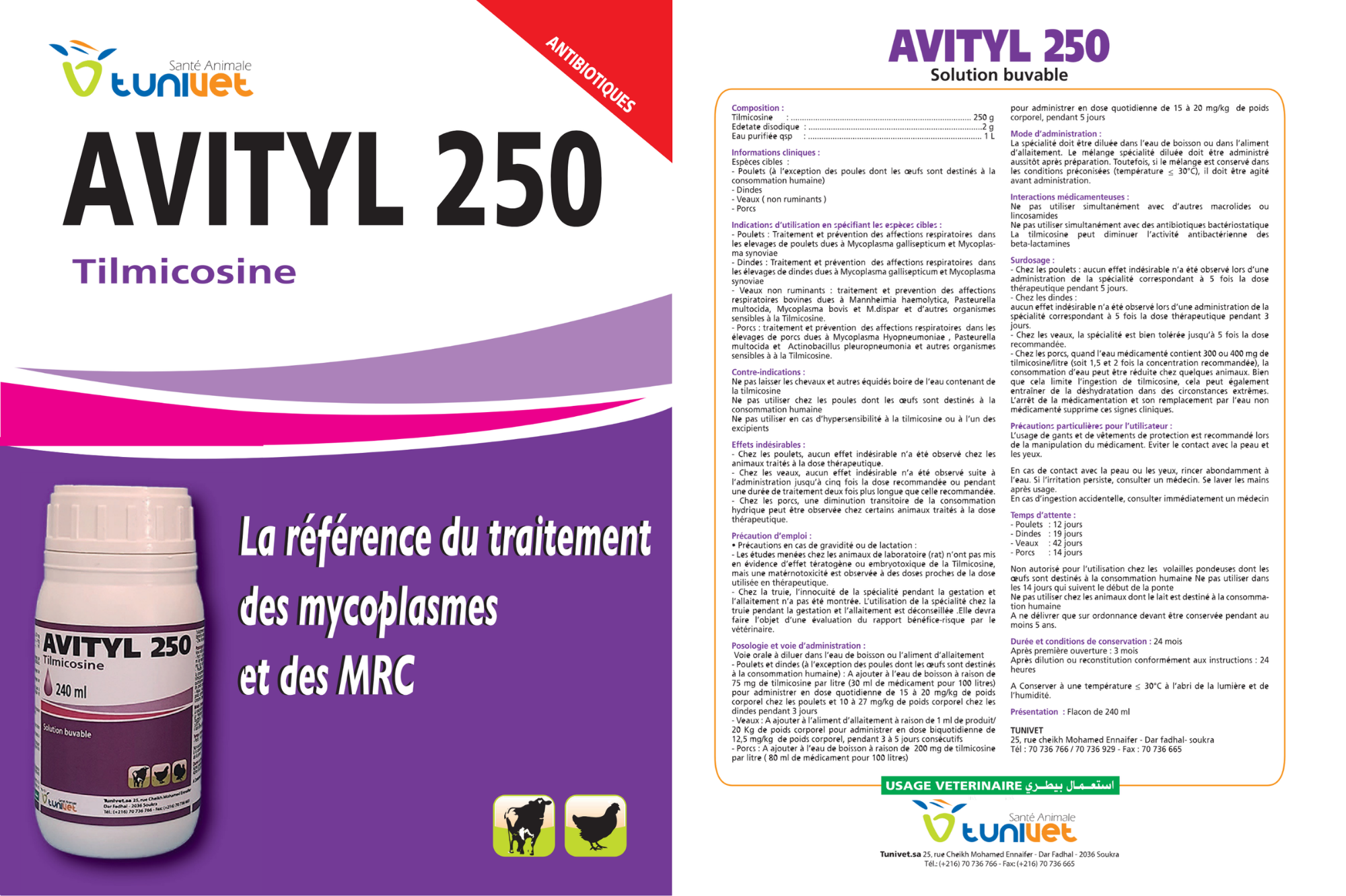 • Poulets : traitement et prévention des affections respiratoires dues à Mycoplasma gallisepticum et Mycoplasma synoviae.