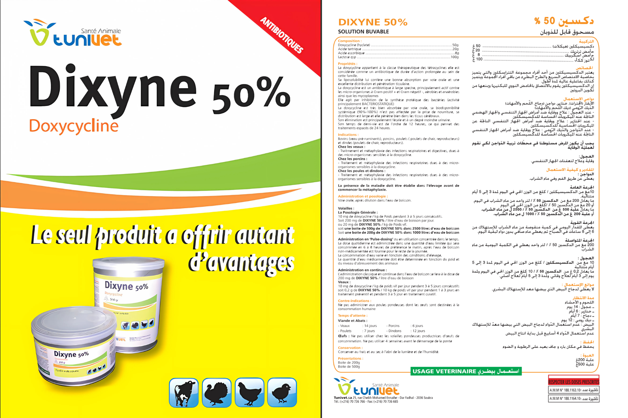 DIXYNE 50% est une poudre orale soluble dont le principe actif est la Doxycycline (hyclate). La doxycycline est un antibiotique de la famille des tétracyclines, reconnu pour son action à large spectre contre une variété de micro-organismes sensibles. Elle agit en inhibant la synthèse des protéines bactériennes, empêchant ainsi la croissance et la multiplication des bactéries.