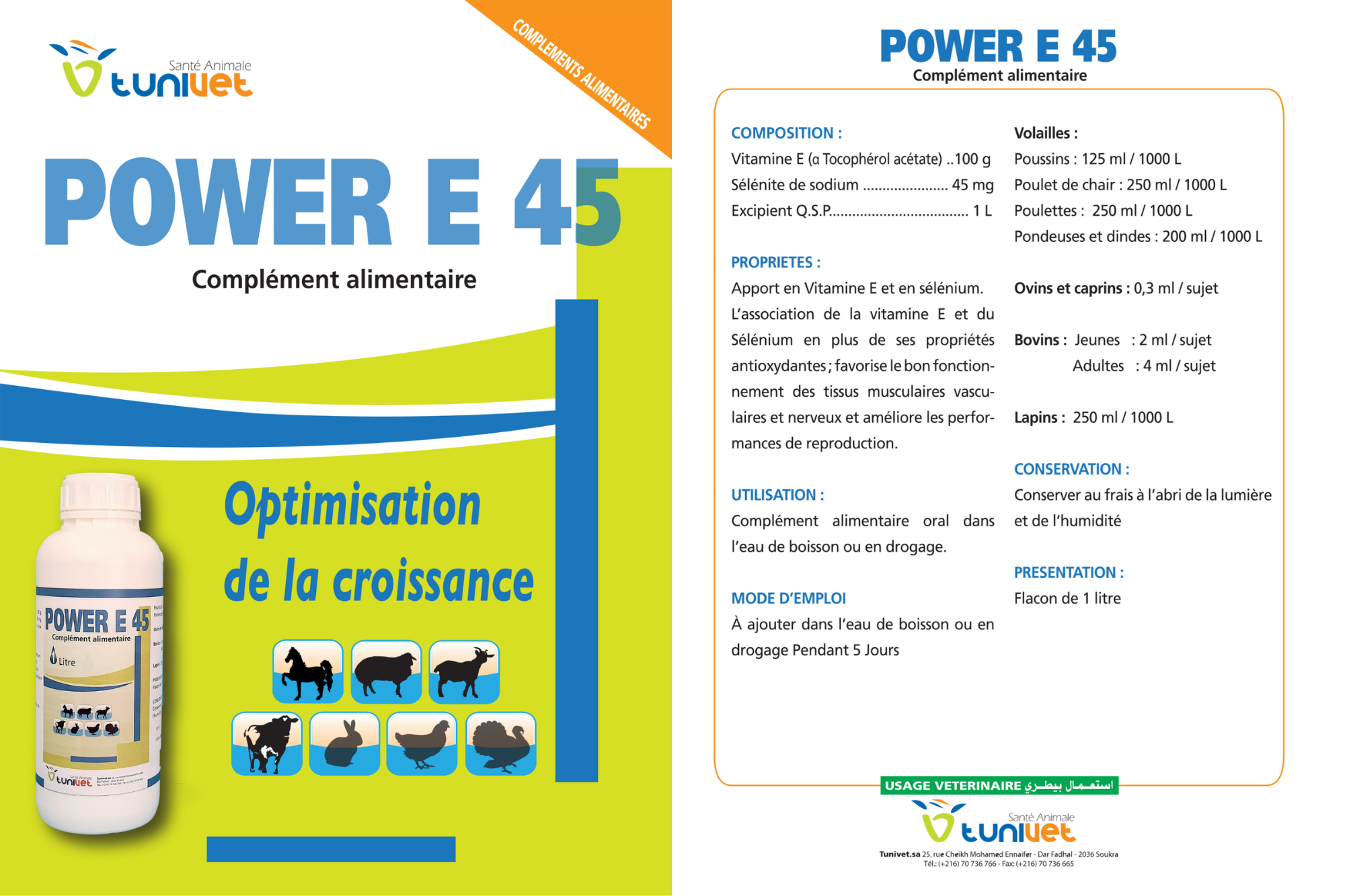 Complément alimentaire orale dans l'eau de boisson ou en drogage qui apporte la vitamine E et le sélénium.